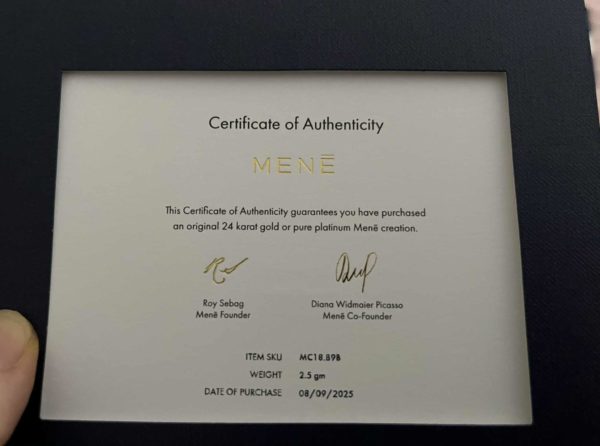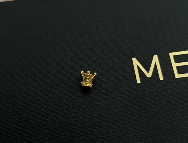 これです。ちっちゃいのですが、さすが純金、重いです。この度、プリンセスの冠のチャームにしました。以前MENEで購入しているので、バースデー割引50ドル引きのクーポンをもらって、それを使いました。