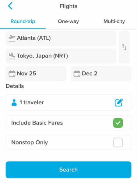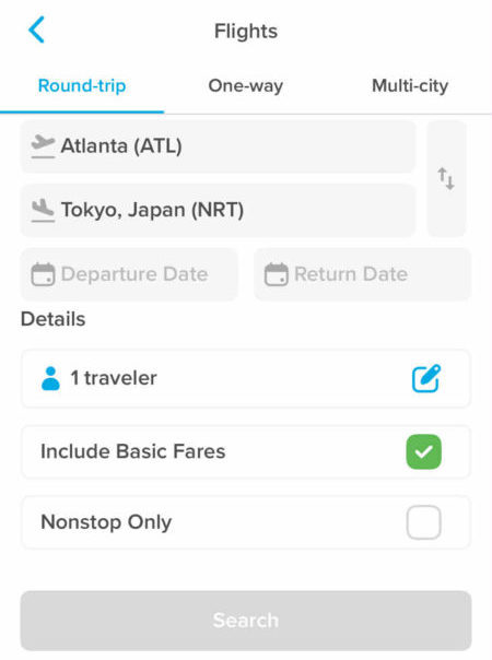 たとえば、日本行の飛行機を予約するとします。上のFlight(フライトアイコンをタップして)