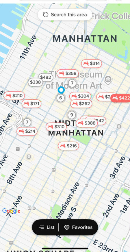下にあるMap(地図)のボタンをタップすると、周辺ホテルの1泊当たりの金額が表示されます。金額をタップすると、宿泊施設の内容を見ることができます。