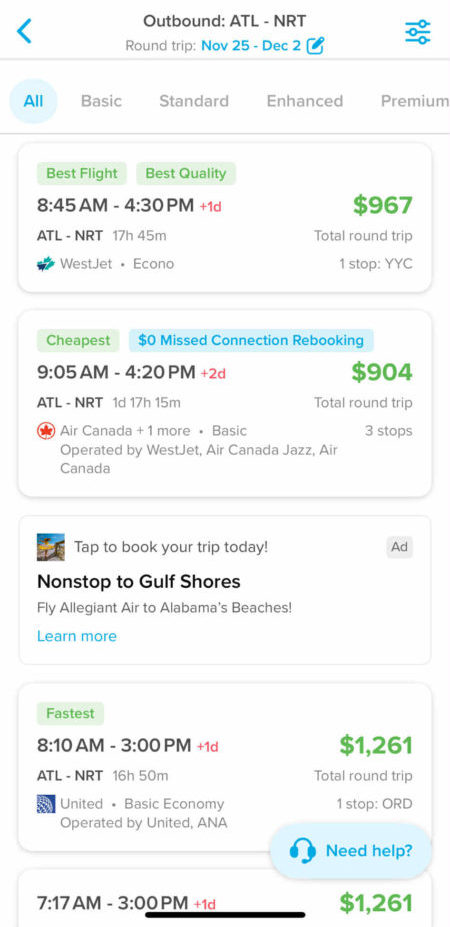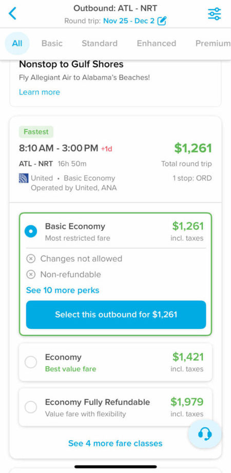 すると、この金額は、ベーシックエコノミーであることがわかります。他にも同じフライトで、内容と価格の異なるものを提示してくれるので、「予約したものがこんな内容だと思ってなかった!」というような間違いを防ぐことができます。