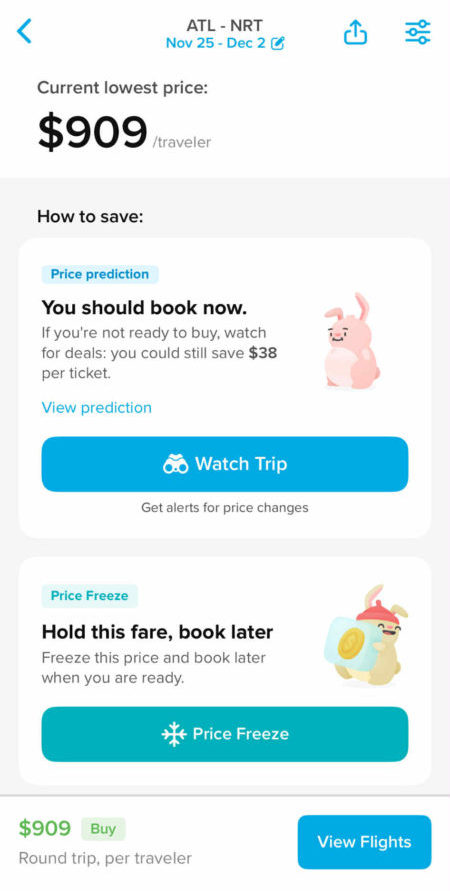 つまり、私たちは日本へ帰国したりしますが、今現在の飛行機代がこれから上がるのか最安値なのか迷った時は、登録しておけば、価格の予測を教えてくれ、「今買うべきか、待つべきか」を教えてくれ、また、下がったら即通知してくれます。