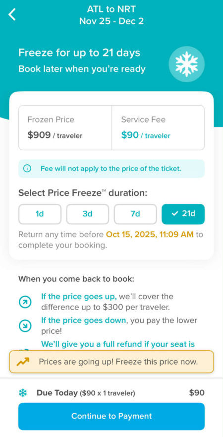 今の価格を凍結しておけます。将来、価格が上がっても、このケースでは300ドルまではHopperがカバーし、手数料もフライト代に充当されます。