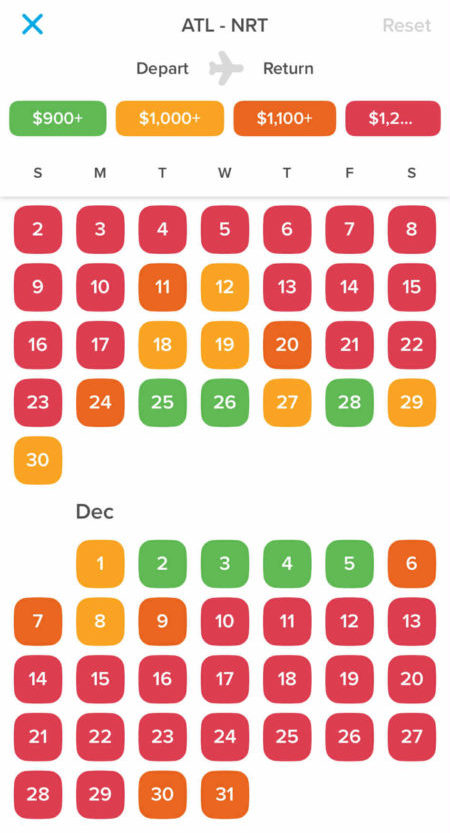 カレンダーで価格帯が色分けされて出てきます。