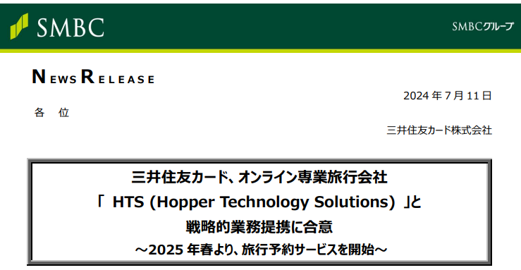 三井住友カードのオンライン専業旅行会社は、Hopperホッパーと業務を提携し、2025年春から三井住友カード会員向けに「Vトリップ」という旅行予約サービスを提供開始しています。