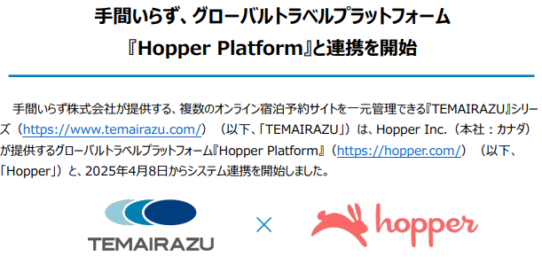 また、手間いらず株式会社は、TEMAIRAZUという旅のプラットフォームを、Hopperホッパーの予約流通網のシステムを使ったものにし、2025年春から活用開始、ホテル予約のさらなる拡大がかなうこととなりました。