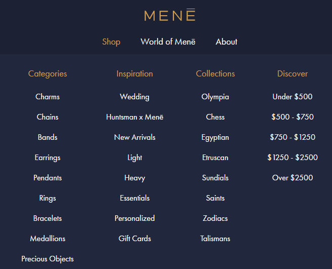 Meneメネのサイトの上のバーのShopショップをクリックすると、様々な商品のカテゴリーが出てきます。